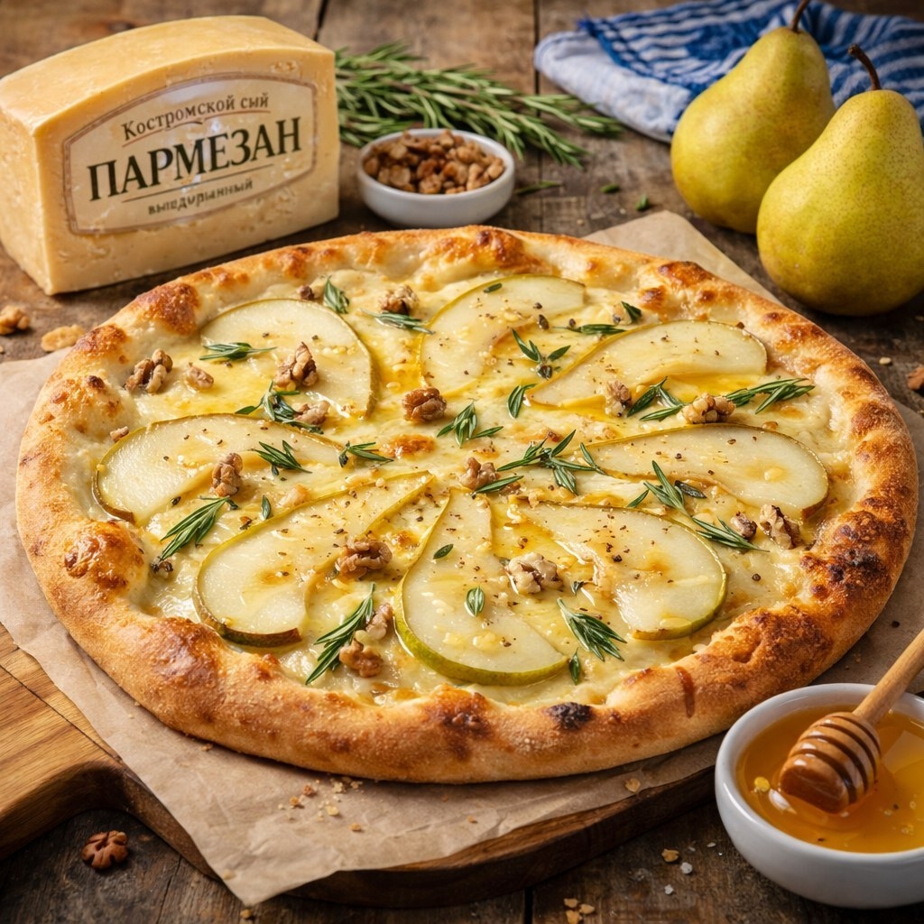 – Выложите ломтики груши и посыпьте их костромским сыром.