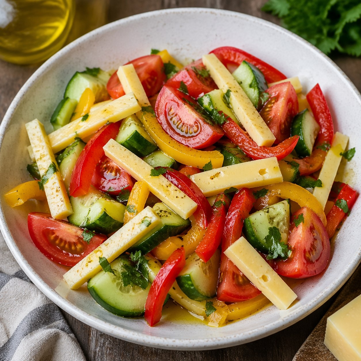 3. Смешивание: В глубокой миске смешайте нарезанные овощи и сыр.
